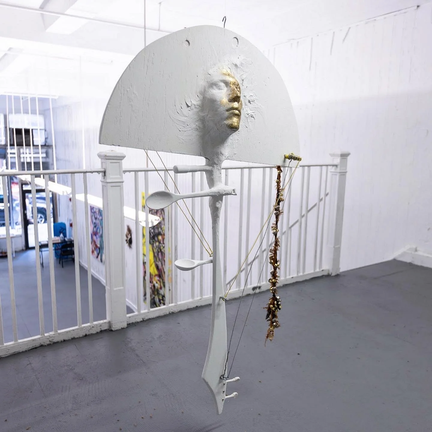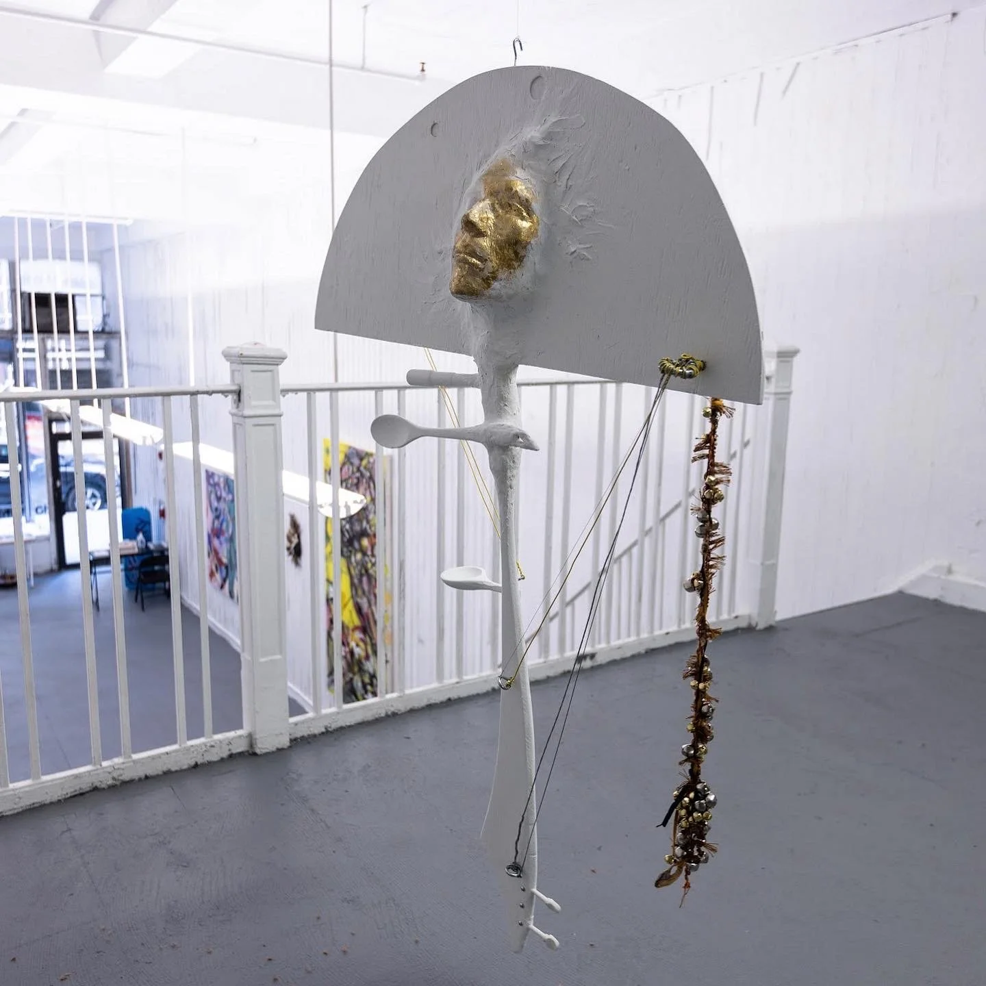 Wood, cello sting, electrical wire, ribbon, bells, gold leaf